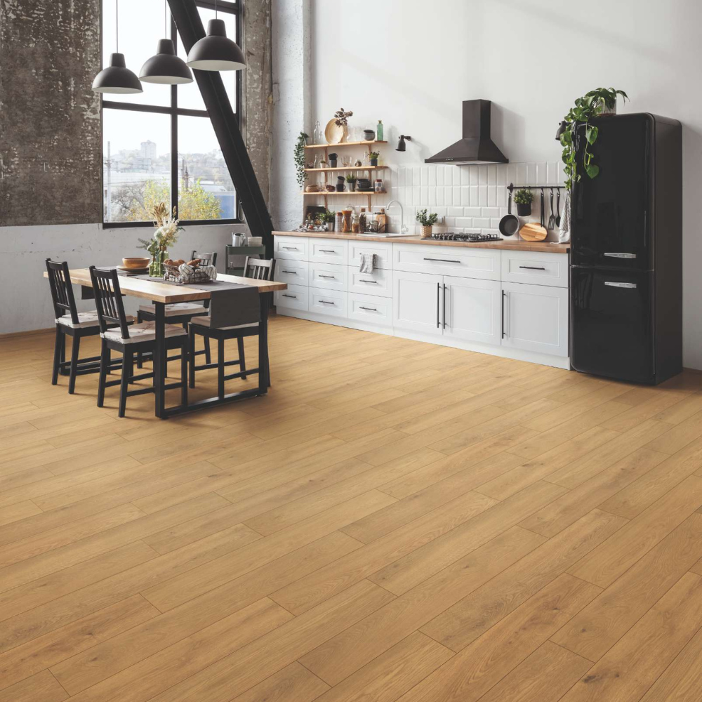 Sàn gỗ Krono Original K726 – Honey Ethereal Oak mang tông màu vàng mật ong ấm áp, tạo cảm giác nhẹ nhàng và tràn đầy sức sống cho không gian. Bề mặt vân ET được xử lý tinh xảo với các đường vân mềm mại, tái hiện vẻ đẹp tự nhiên và hiện đại của gỗ sồi. Thiết kế bản tiêu chuẩn (Standard Plank) cùng độ dày 12mm giúp sàn chắc chắn, ổn định và dễ dàng ứng dụng trong nhiều không gian như phòng khách, phòng ngủ hay văn phòng, đặc biệt phù hợp với phong cách nội thất sáng, ấm và gần gũi.