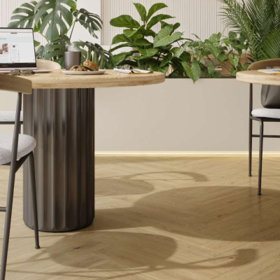 Sàn gỗ Krono Original K847 – Blonde Montanara Oak mang tông màu gỗ sồi sáng tự nhiên với sắc vàng be nhẹ nhàng, giúp không gian trở nên thoáng đãng và hiện đại hơn. Bề mặt vân MR được hoàn thiện tinh tế với các đường vân rõ nét, tạo hiệu ứng chân thực và gần gũi như gỗ thật. Thiết kế xương cá (Herringbone) đặc trưng cùng độ dày 8mm mang lại điểm nhấn thẩm mỹ nổi bật, giúp không gian trở nên sang trọng, có chiều sâu và phù hợp với nhiều phong cách nội thất từ tối giản đến hiện đại.